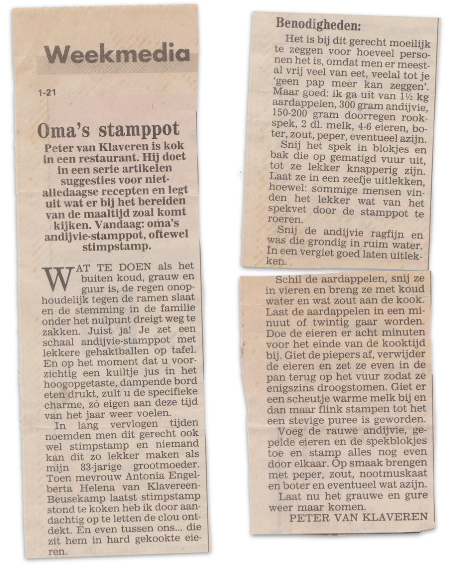 Wat te doen als het buiten koud, grauw en guur is, de regen onophoudelijk tegen de ramen slaat en de stemming in de familie onder het nulpunt dreigt weg te zakken. Juist ja! Je zet een schaal met andijvie-stamppot met lekkere gehaktballen op tafel. En op het moment dat u voorzichtig een kuiltje jus in het hoogopgetaste, dampende bord eten drukt, zult u de specifieke charme, zo eigen aan deze tijd van het jaar weer voelen.
