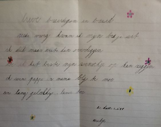 Tante Bets had het wensje duidelijk op een lijntjesblaadje geschreven, zo dat ik het woord voor woord over kon schrijven. Ik wilde mooi schrijven dat ging niet zo snel, want ik zat in de eerste klas.