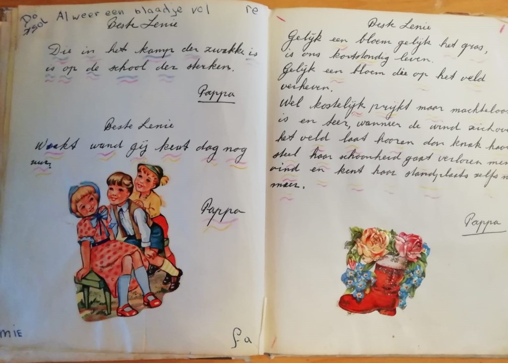 Toen ons jongste zusje Leny naar de lagere school ging, was er financieel wel wat veranderd en kon er voor haar zo’n prachtig boekje gekocht worden. Velen schreven er leuke en grappige verhaaltjes of versjes in.