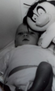 Mijn zoon Peter van een maand of acht, lag tussen twee kussens in op zijn rug in het tweepersoonsbed van mijn ouders.